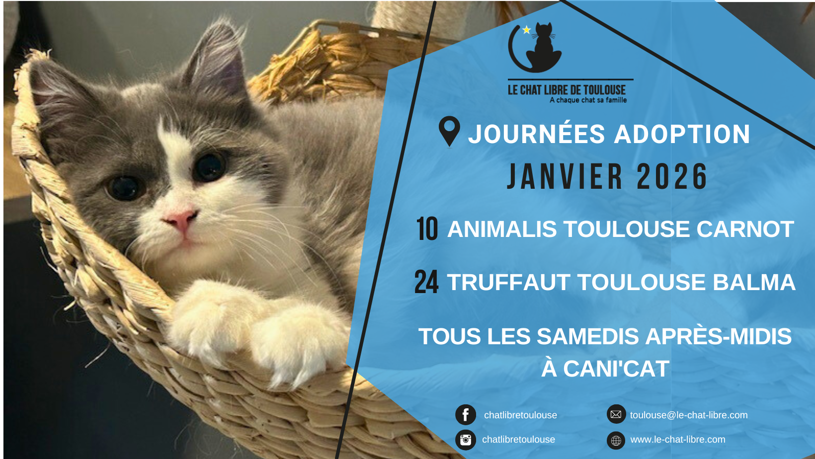 RDV le samedi 17 janvier 2026, de 14h à 17h30, à Cani'Cat : 137 chemin de Basso Cambo - 31100 Toulouse. Aucun chat ne sera présent mais il sera possible de prendre RDV pour les voir rapdement.